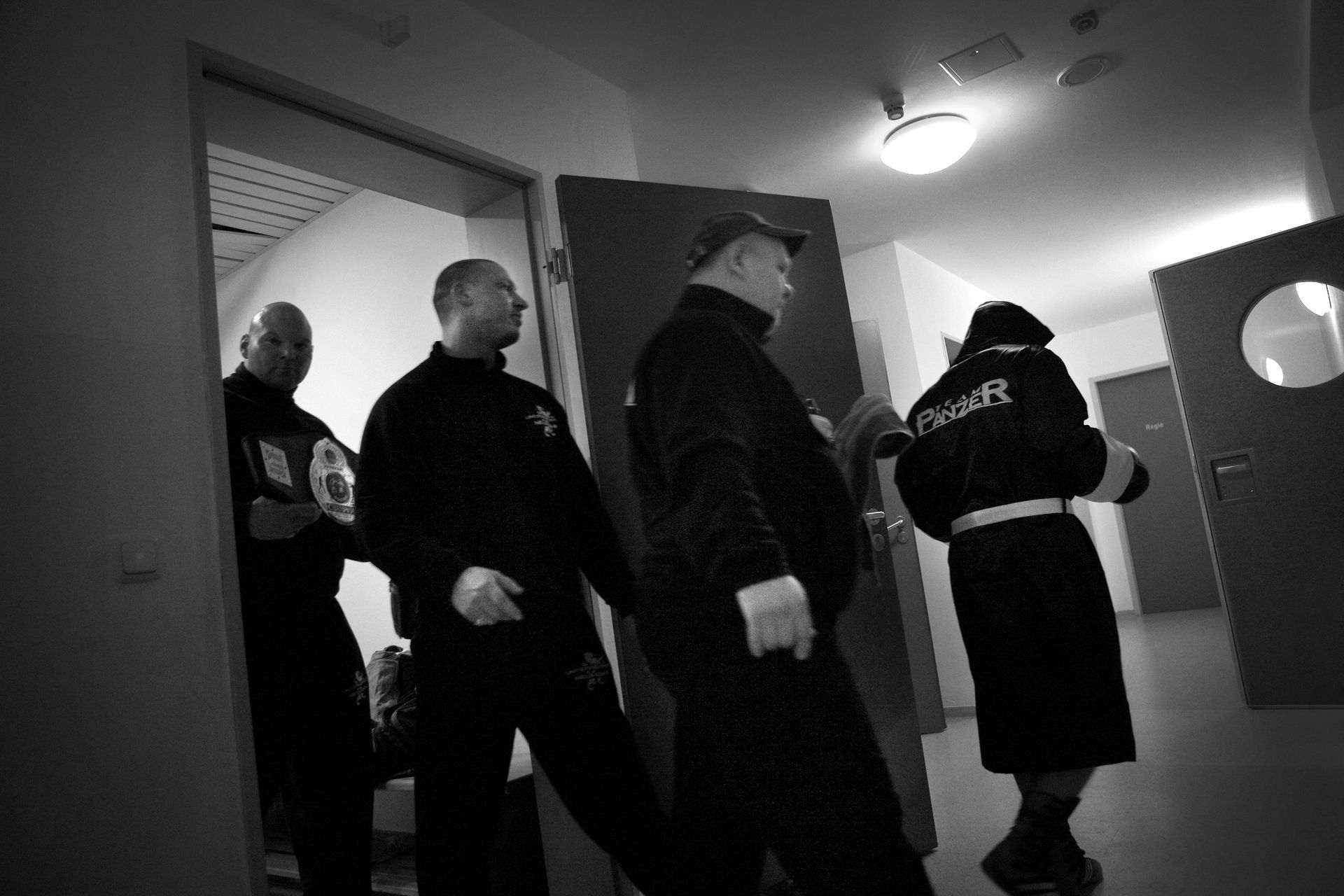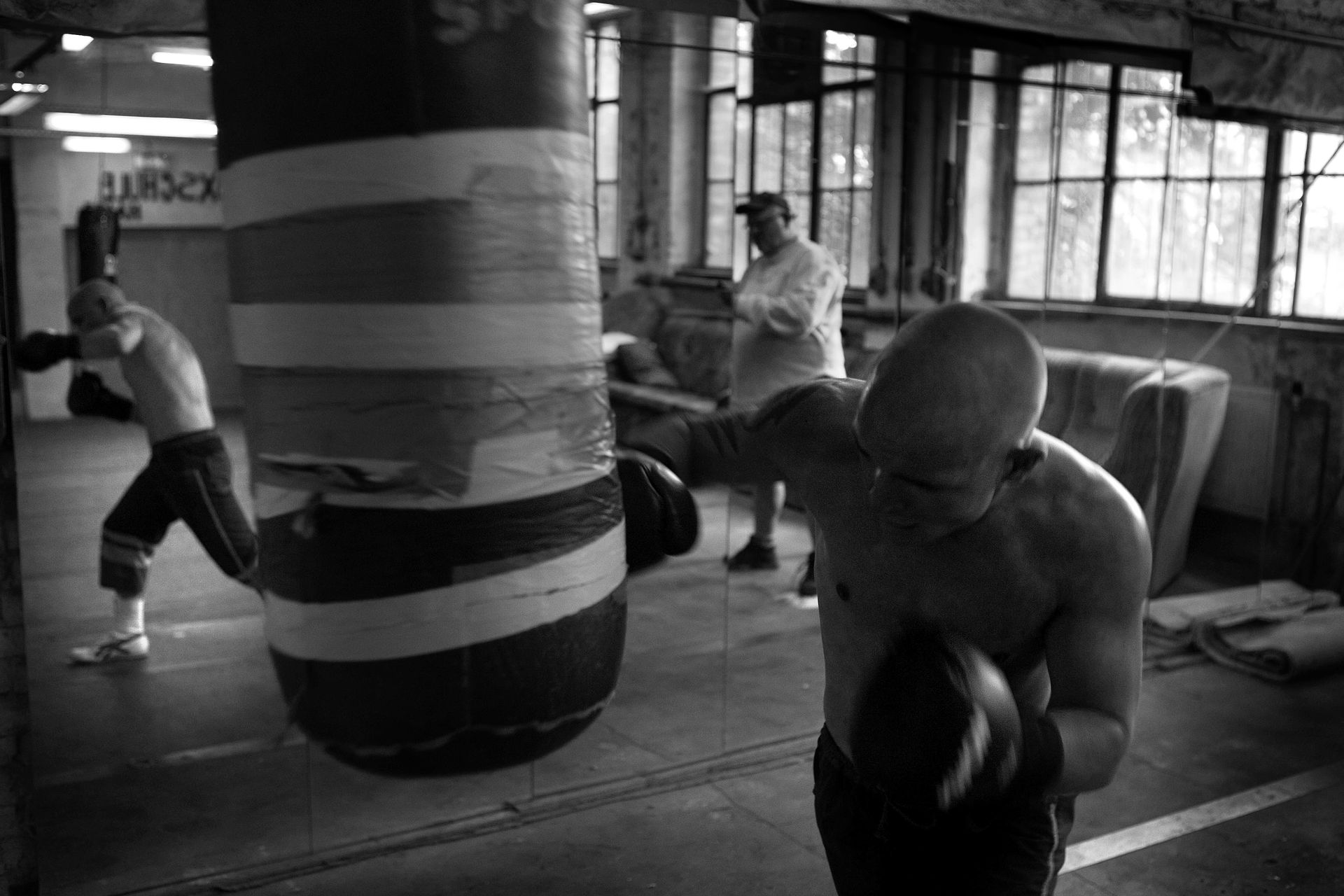 Boxen war schon immer ein Sport von Underdogs. Seit acht Jahren befindet sich in einem baufälligen Abrisshaus in Halle an der Saale ein Boxcamp, in dem sich junge Männer im wahrsten Sinne des Wortes aus den schlechten Verhältnissen ihres Lebens herausboxen können. Wer kann, haut ab. Wer hierbleibt, muss sich mit dieser Stadt arrangieren. „Hier hat man nichts“, sagt Sven Haselhuhn und blinzelt in die Sonne. Während die anderen eine Runde um den Block joggen, sitzt er in einem alten Sessel vor dem Eingang der Boxschule. Im härteste Profiboxcamp Deutschlands, wie es auf der hauseigenen Website vorgestellt wird, muss im Winter erstmal Holz gehackt werden, da das seit mehreren Jahren zum Verkauf ausgeschriebene Haus an der Berliner Straße nur mit alten Holzöfen beheizbar ist. Duschen gibt es keine. Der Putz bröckelt von den Wänden und die Sandsäcke sind notdürftig geflickt. Und was die restliche Einrichtung betrifft, so sieht diese auch eher wie vom Sperrmüll zusammengetragen aus. Beim Boxtraining hat nur einer das Kommando: der 46 Jahre alte Uwe Schuster, genannt „Commander“. Uwe Schuster, der bullige frühere Boxer, der während seiner Zeit auf der Kinder- und Jugendsportschule in Berlin zu den größten Talenten der DDR zählte, sieht sich aber auch in der Rolle des Sozialhelfers. „Hier können sich die Jungs entfalten und kommen nicht auf dumme Gedanken. Wenn sie Party machen wollen, dann hier.“ Während die Boxer im Innenhof ihre Liegestützen machen und mit Hanteln in den Händen Schattenboxen, dröhnt laute Hip-Hop-Musik aus dem Fenster im obersten Stock. Der Rapper Mastino hat für Schuster und seine Boxer ein Lied geschrieben, mit dem sie bei ihren Kämpfen zum Ring marschieren. Darin heißt es: „Das Ghetto schlägt zu, ich box mich aus dem Dreck. Gib mir nur eine Chance, und ich schmiede mein Glück.“ Text: Arne Leyenberg